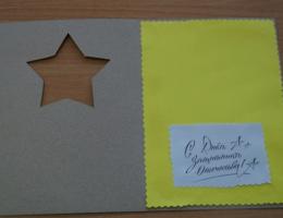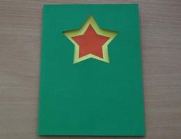 6. Ровно по центру отверстия, закрыв открытку, аккуратно приклеиваем маленькую звездочку. 7. Проверяем как это выглядит изнутри.