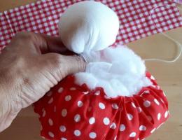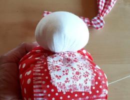 Получилась головка куклы (фото 3). 2. В центр юбки положите монетку, наполнитель, а потом стяните ниткой, вставьте головку и завяжите (фото 4, 5). 3.